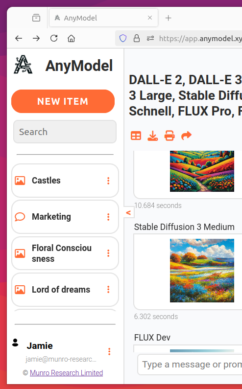 You can open the image selection window and adjust the selected models in the same way as for text models. Once you submit your prompt, your selected models will produce a range of image results. You can adjust the number of images show in each row by pressing the button, and images can be downloaded (), printed () or shared (). Click images to view them in full screen. You can download an individual image by right clicking it on PC or long tapping it on mobile.